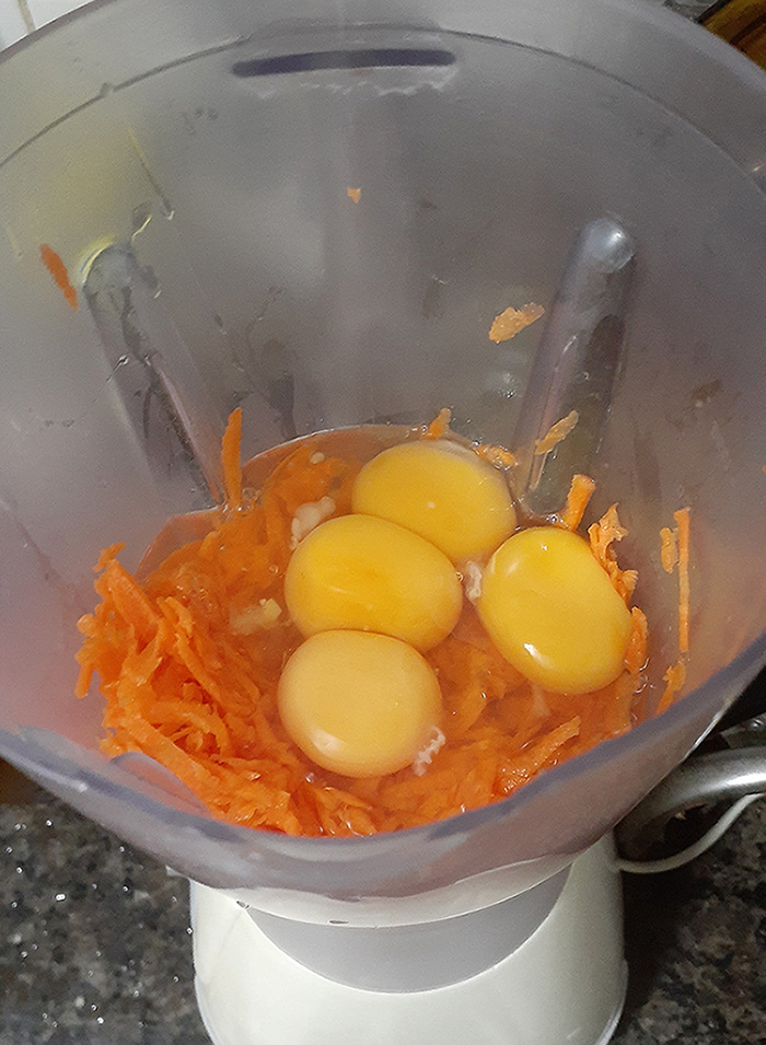 Now that you have shredded them, put them in a blender. Add the Eggs and the Oil. If this looks gross to you then I have some news about how every cake you've ever eaten was made.