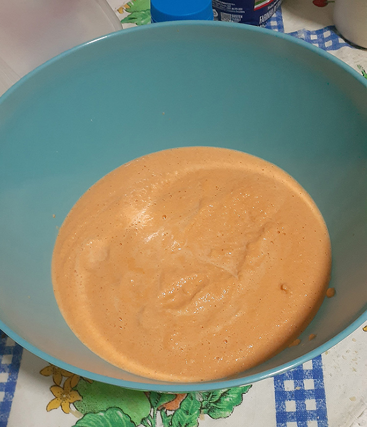 After you've blended them, you should have some Carrot Slop. Pour the slop into a bowl. It should look like this, with no huge bits of carrot anywhere: