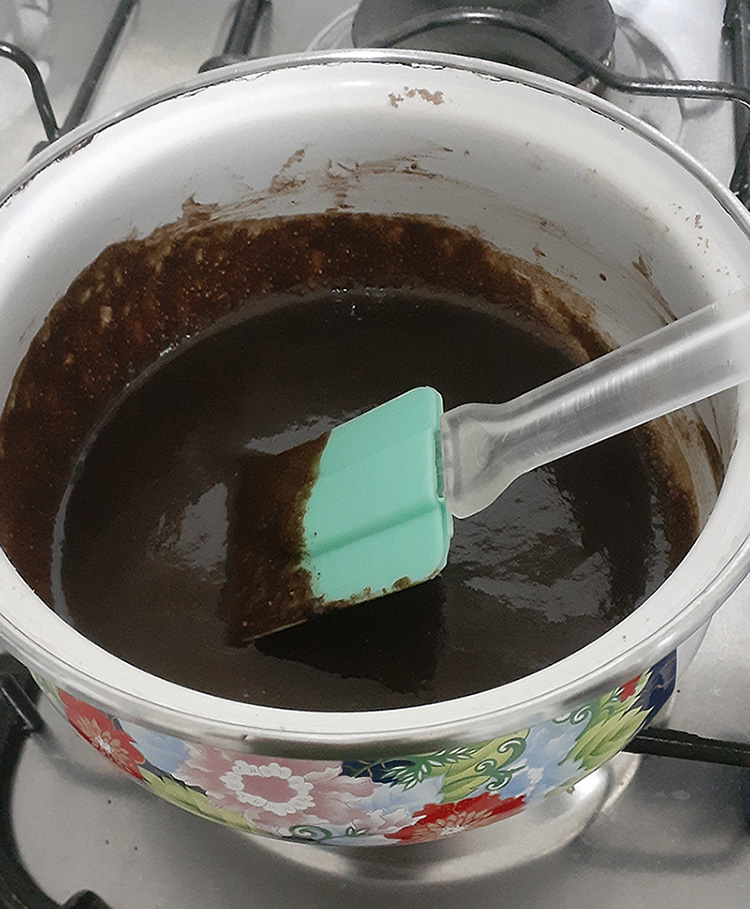 Get a cooking pot, and put it on the stove at a low heat. First, put the Butter and the Milk, and mix them until the butter melts. Then you can add the Sugar and the Cocoa Powder. Mix it until it looks uniform.
